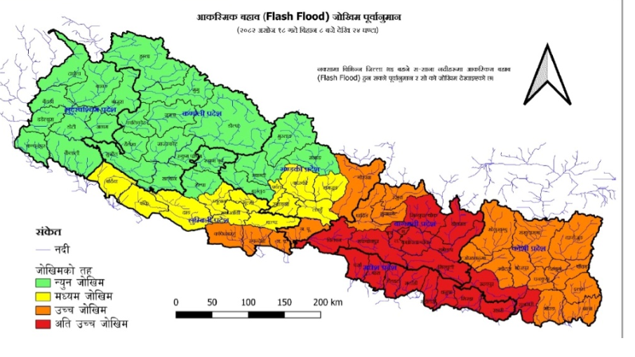 उनका अनुसार अहिले तत्कालको अवस्थामा पूर्वी राप्ती, नारायणी, बागमती, कमला नदी र कोशी जलाधार क्षेत्रमा बाढी आउने सम्भावना छ । अहिलेसम्म यी नदीको बाढीले सतर्कताको तह पार गरिसकेको छैन । तर आज दिउँसोदेखि कमला, बागमती र नारायणी नदी तथा यी नदीका शाखा नदीहरुमा सतर्कता तह पार हुने सम्भावना छ ।