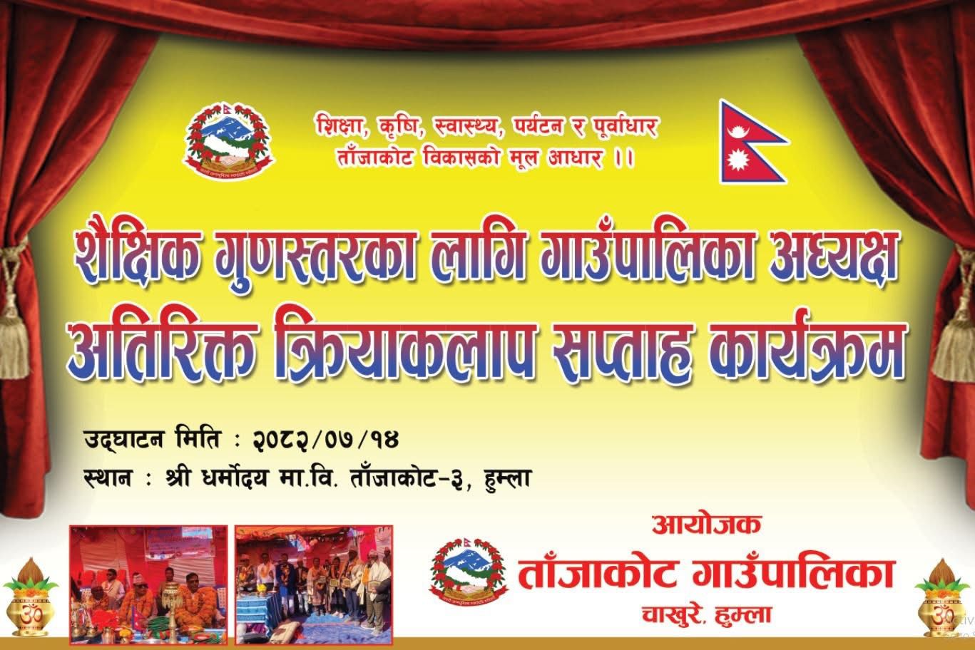 हुम्ला। ताँजाकोट गाउँपालिकाले शैक्षिक गुणस्तर सुधारका उद्देश्यसहित ‘गाउँपालिका अध्यक्ष अतिरिक्त क्रियाकलाप सप्ताह’ कार्यक्रम सुरु गर्न लागेको छ। आगामी मिति २०८२ साल कात्तिक १४ गतेदेखि शुरु हुने यस कार्यक्रम गाउँपालिका वडा नं. ३ स्थित श्री धर्मोदय माध्यमिक विद्यालय, चाखुरेमा सञ्चालन हुने भएको हो।