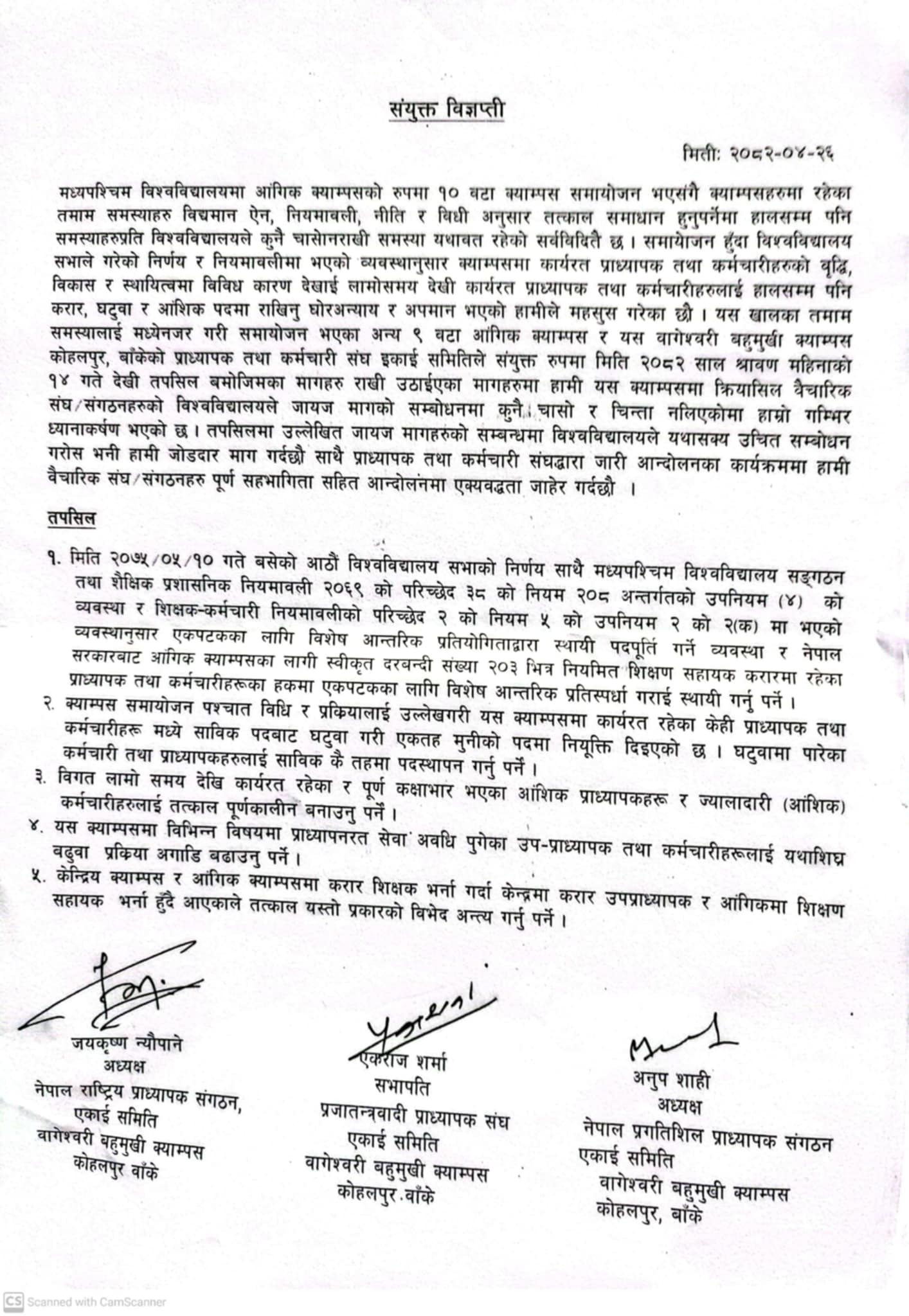 संयुक्त विज्ञप्तिमा करार, घटुवा र आंशिक पदमा लामो समयदेखि कार्यरत प्राध्यापक तथा कर्मचारीलाई स्थायीकरण नगरी निरन्तर अन्याय गरिएको उल्लेख गरिएको छ।